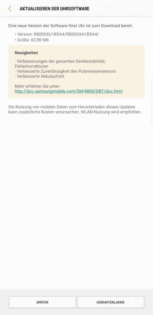 Dans le journal des modifications, Samsung dresse la liste des améliorations apportées à la stabilité globale de l’appareil et aux corrections d’erreurs, à la fiabilité du capteur de fréquence cardiaque et à l’autonomie de la batterie. Je suis particulièrement excité par les deux derniers points, parce que mon cardiofréquencemètre est un peu chiant quand il entre en contact avec le bracelet métallique.