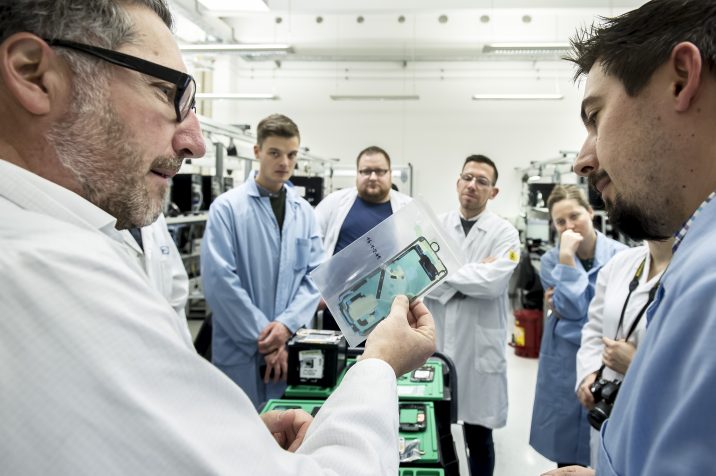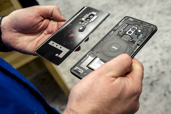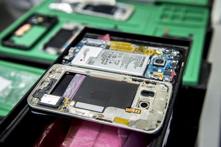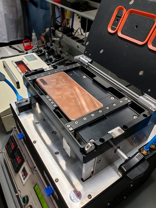 Il s’agit en fait d’un immense atelier où les smartphones sont vissés et dévissés tous les jours. Comme la plupart des nouveaux smartphones de Samsung ne peuvent plus être ouverts à la maison, la première chose à faire est de les mettre dans un petit four bleu et de les chauffer pendant un certain temps jusqu’à ce que la colle retenant le verre au dos se détache. Dès que l’appareil sort du four, il est placé dans une petite machine qui utilise le vide pour séparer l’arrière de l’appareil du reste du smartphone en une minute.