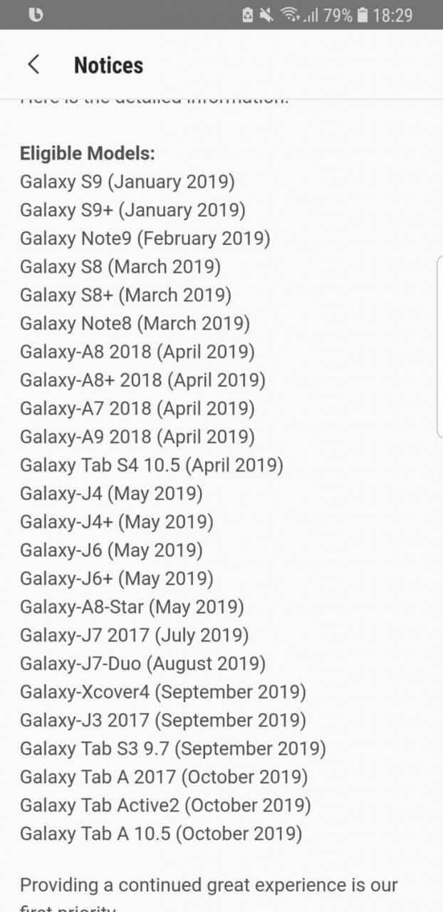 La liste est agréablement longue et annonce pour la Note9 la mise à jour pour février 2019 et pour la S8 la mise à jour pour mars 2019.
